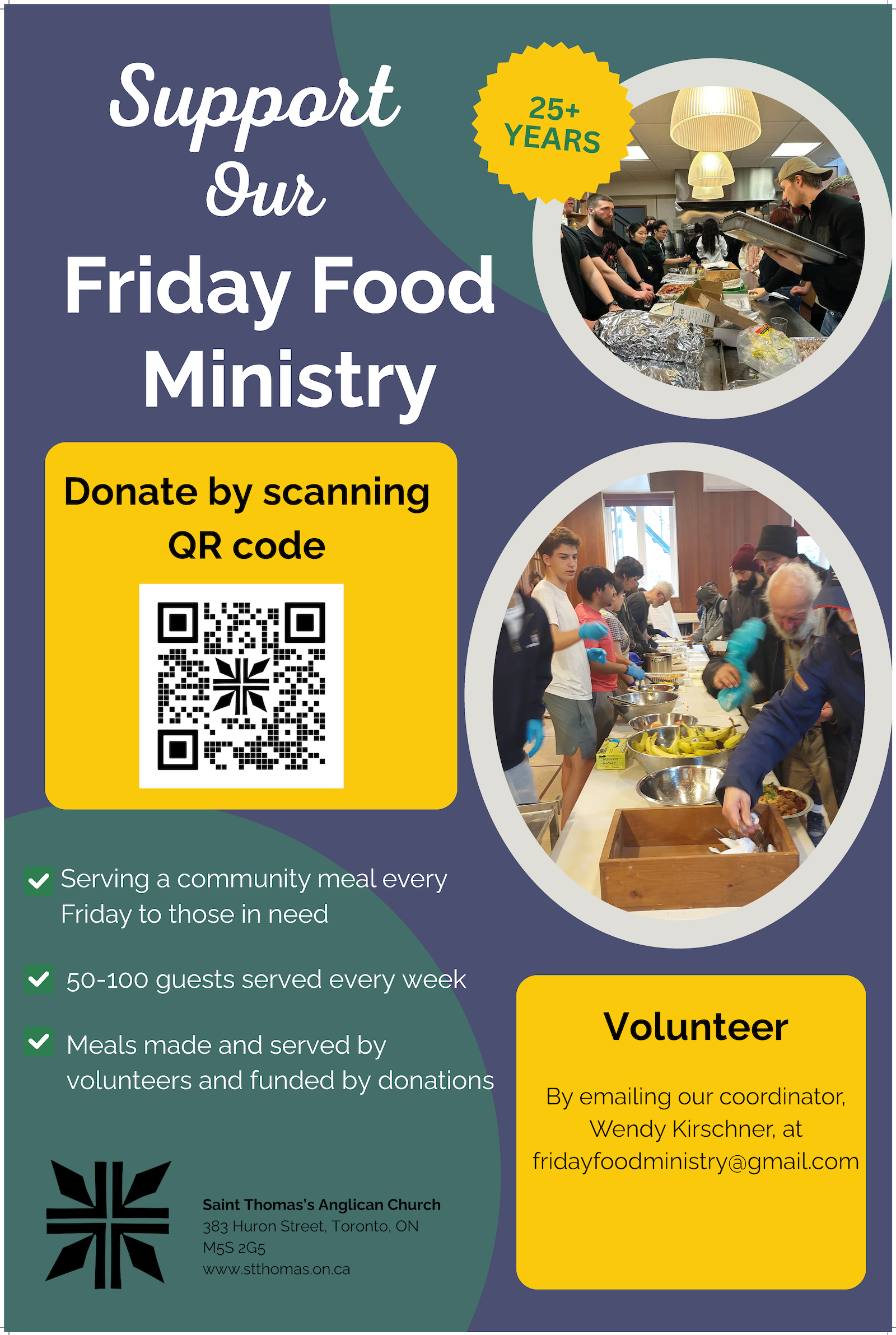 Find out about our weekly food program through which we feed 50 to 100 guests each Friday. The FFM’s annual Thanksgiving Dinner is coming up on October 13—fourteen turkeys will be roasted! There are several ways you can help out at the church or from home. To find out, scroll down to “Friday Food Ministry News” in this week’s issue of The Thurible. Donations are much appreciated, especially given the rising cost of food. Either scan the QR code below or visit this link and select the button for Friday Food Ministry. We appreciate your support!
